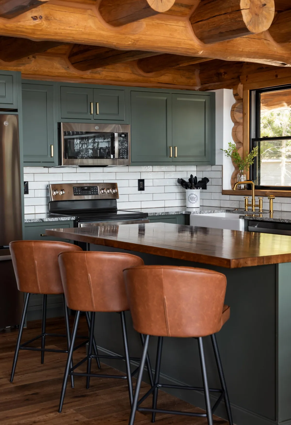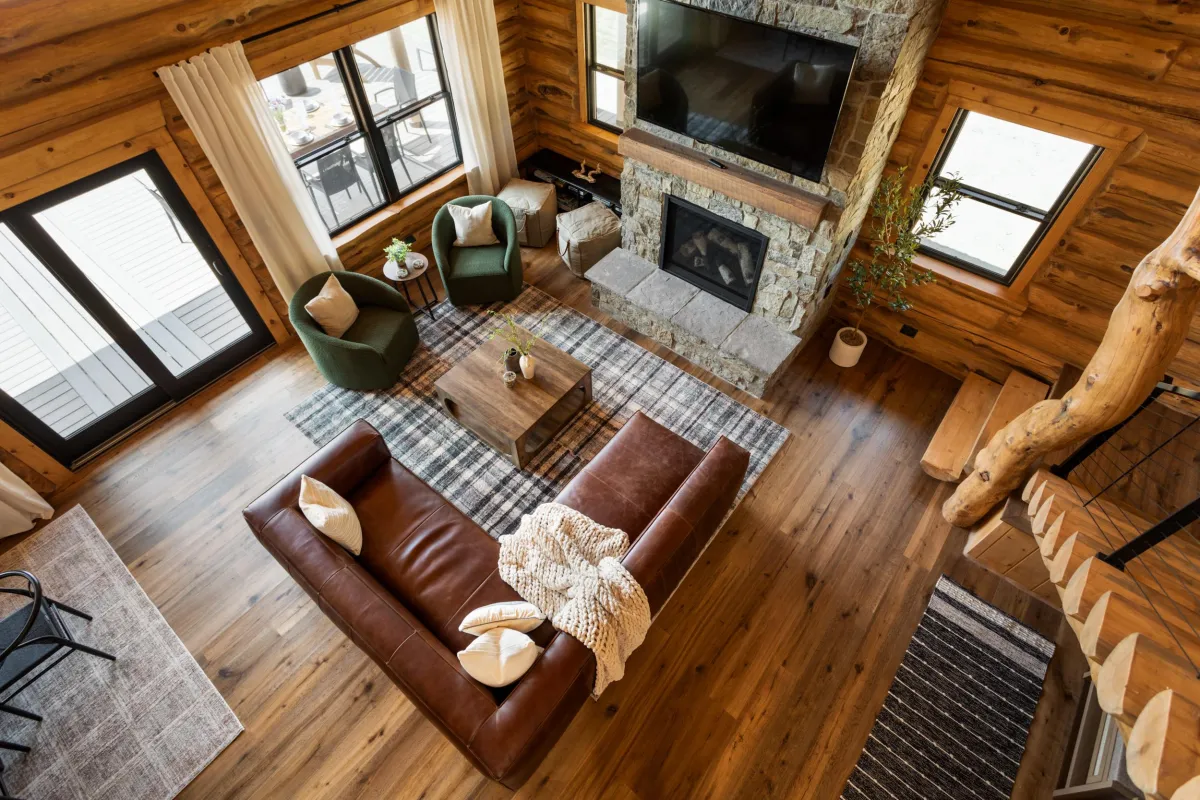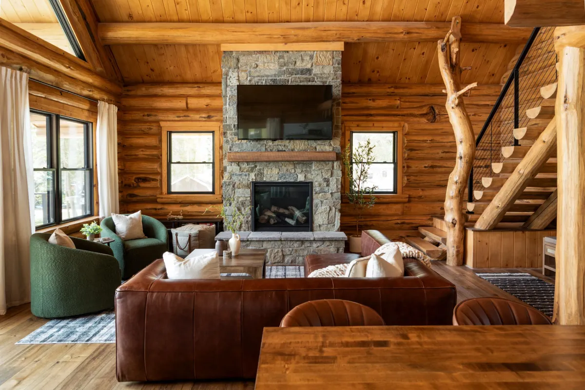 Inside the Cabin: 4 bedrooms (5 beds) + 2.5 baths, fully equipped kitchen with stainless-steel appliances, living area with record player & lake views, 55” Roku TV, and cozy lookout area.